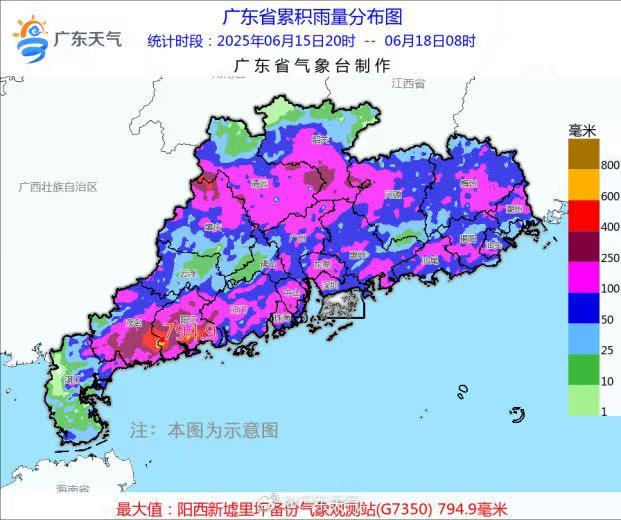 广东气象部门表示,“龙舟水”期间全省平均降水量343.8毫米,较近30年同期(321.1毫米)偏多7%,比2024年(417.7毫米)偏少18%,共出现5次区域性暴雨过程(5月23日至24日、5月29日、6月3日、6月12日至15日,6月16日至18日),呈现前少后多、西多东少的特点。6月中旬,受台风“蝴蝶”、季风等先后影响,广东出现了特强等级区域性暴雨过程,也是今年以来最强降水过程,其中阳西县程村镇录得最大1小时雨量142.6毫米,打破阳江市1小时雨量记录。